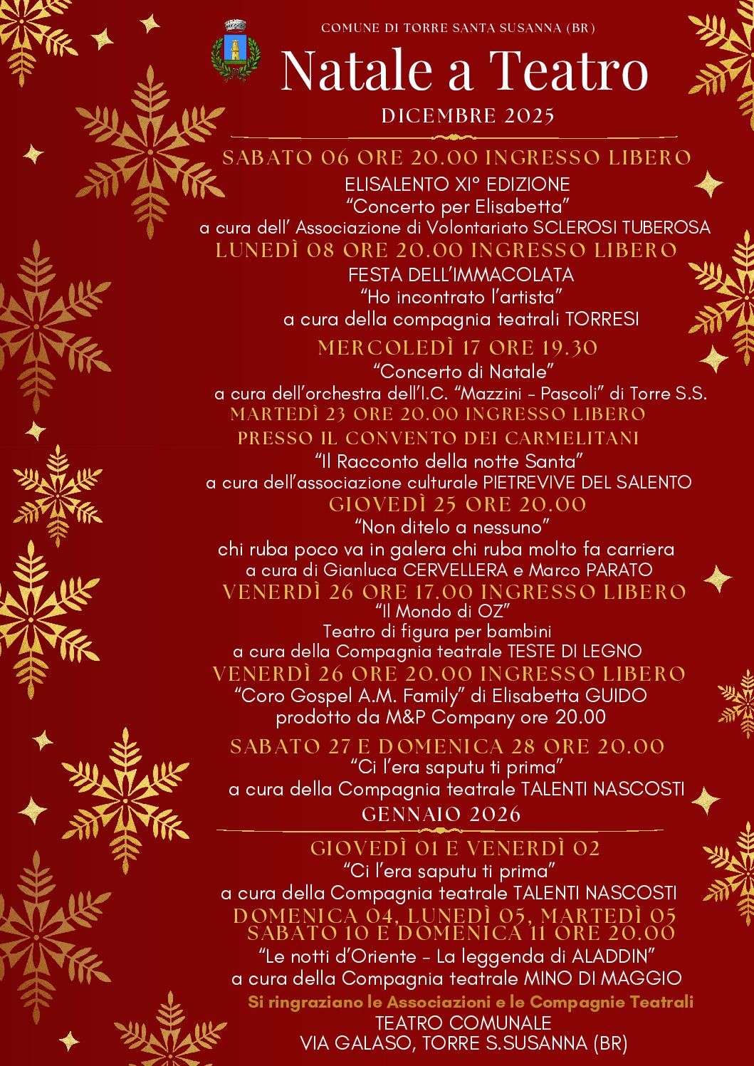 Programma di appuntamenti per il mese di Dicembre 2025 e Gennaio 2026, presso il Teatro Comunale.