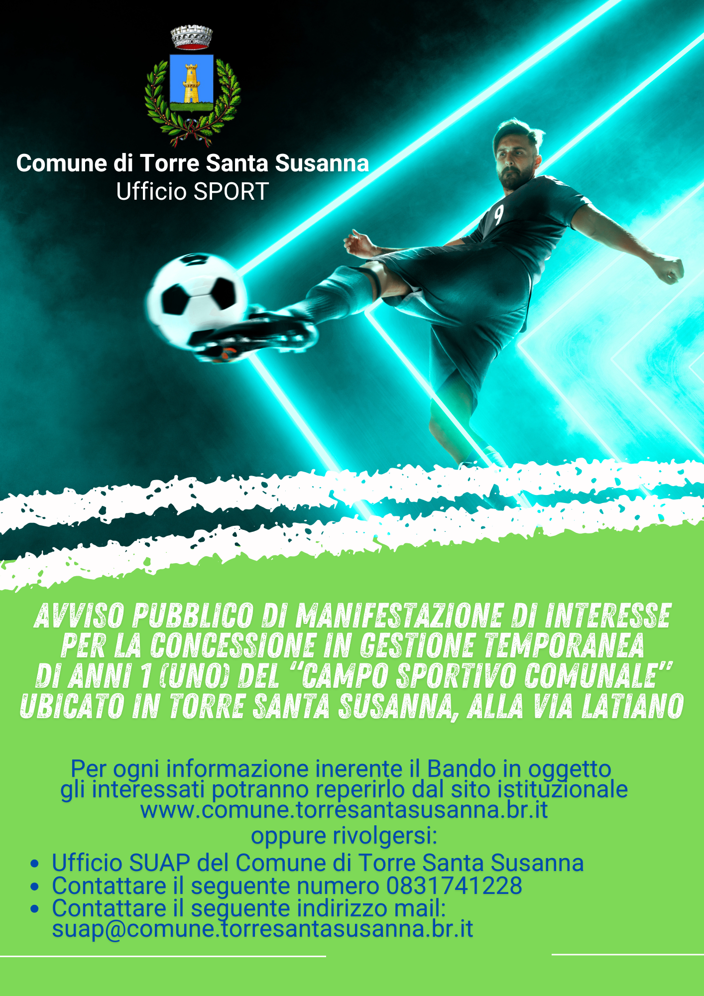 AVVISO PUBBLICO DI MANIFESTAZIONE DI INTERESSE PER LA CONCESSIONE IN GESTIONE TEMPORANEA DI ANNI 1 (UNO) DEL “CAMPO SPORTIVO COMUNALE” UBICATO IN TORRE SANTA SUSANNA, ALLA VIA LATIANO.