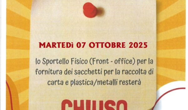 Si avvisa la cittadinanza che lo sportello fisico (front – office) per la distribuzione dei sacchetti della raccolta differenziata resterà chiuso nella giornata di martedì …