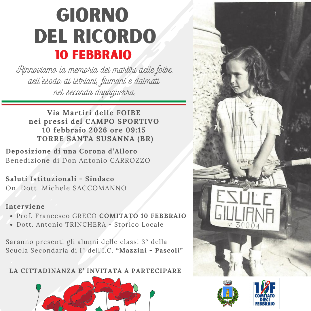 Il Comune di Torre Santa Susanna si unisce al ricordo delle vittime delle foibe e dell’esodo giuliano-dalmata, una tragedia che ha segnato profondamente la storia del nostro Paese.