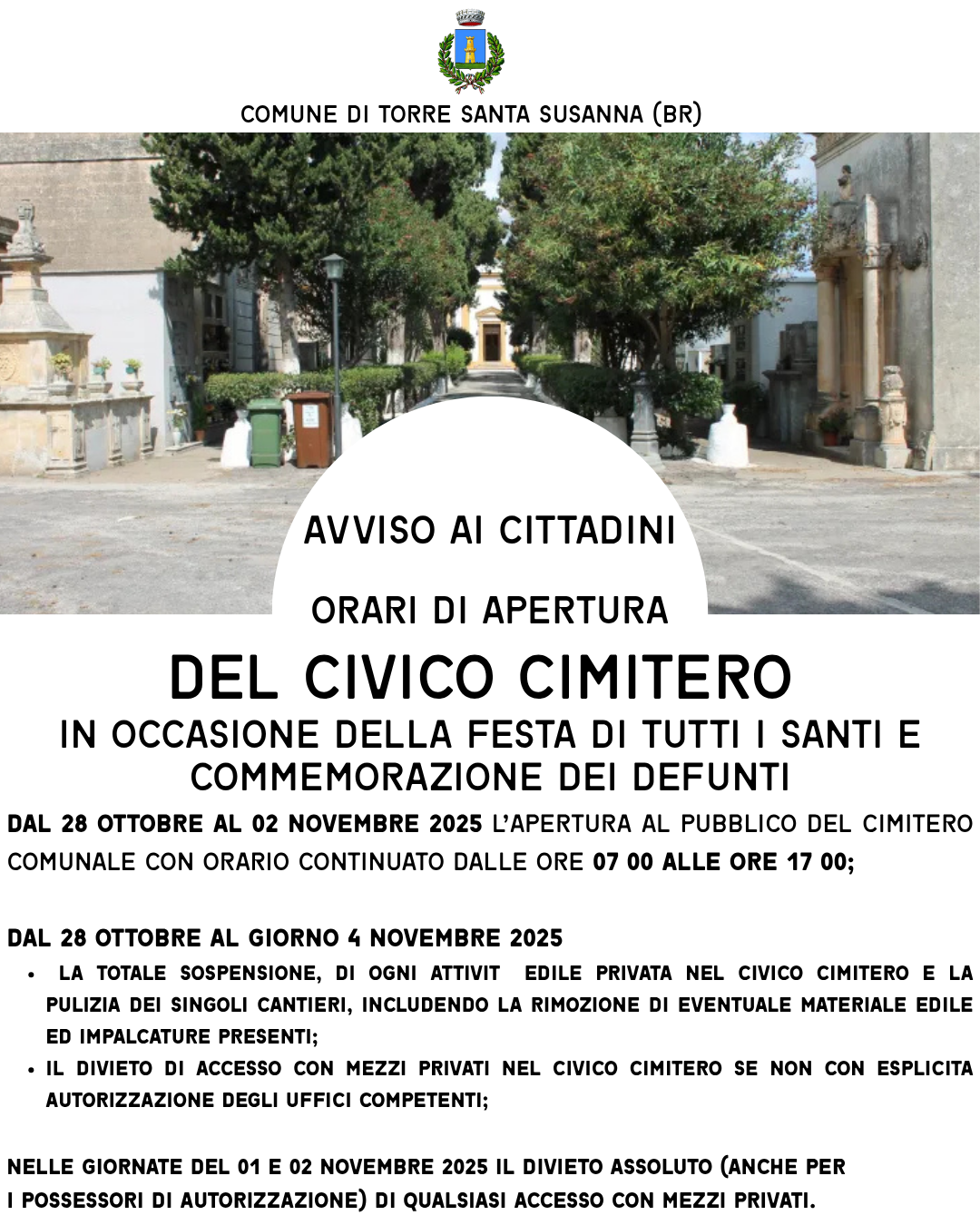- ππ§ π―π’π π¬ππ«ππ¨π«ππ’π§ππ«π’π, Dal 28 Ottobre al 02 novembre 2025 lβapertura al pubblico del Cimitero Comunale con orario continuato dalle ore 07:00 alle ore 17:00
