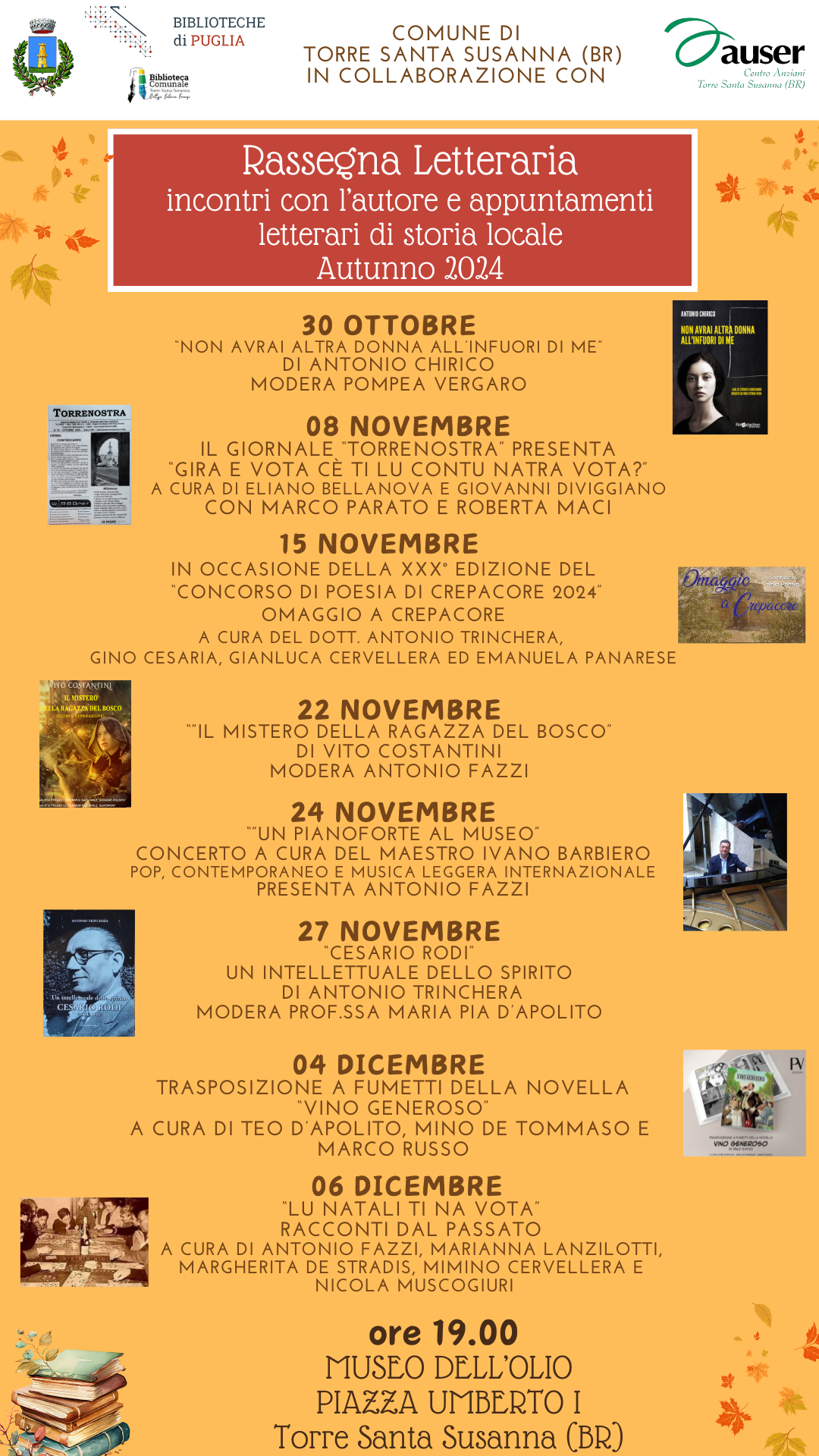 In programma n. 6 appuntamenti organizzati in collaborazione con l’associazione AUSER di Torre Santa Susanna, presso la sala centrale del Museo dell’Olio sito in Piazza Umberto I.